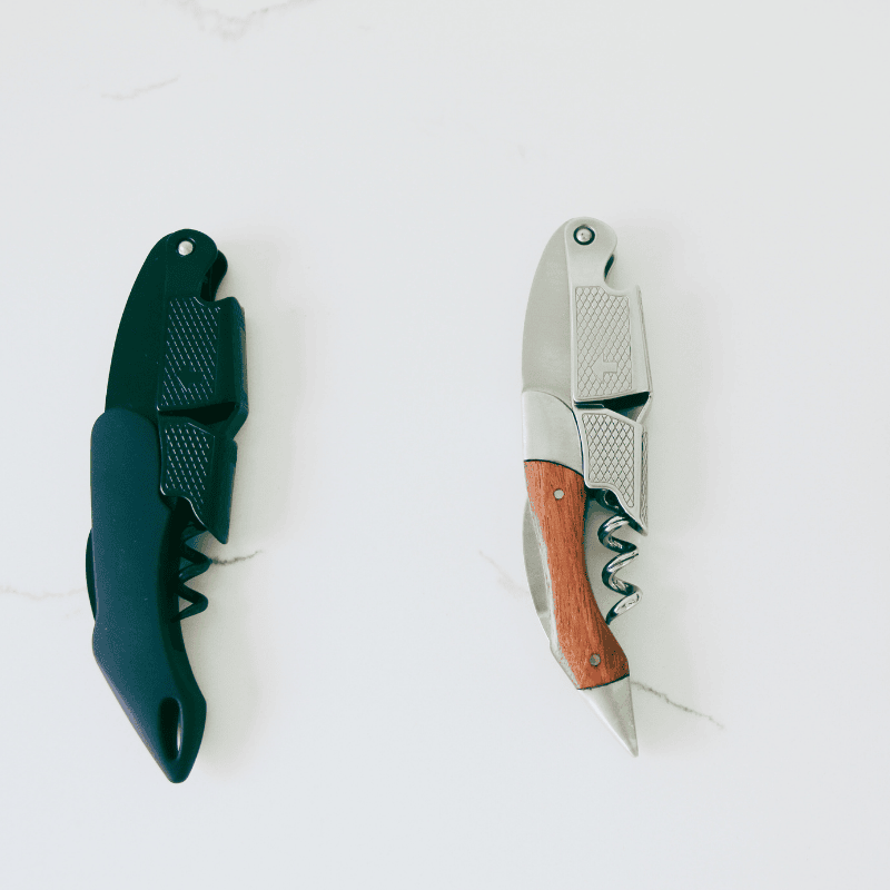 Our sleek dark grey stainless steel wine opener effortlessly removes corks from any wine bottle.